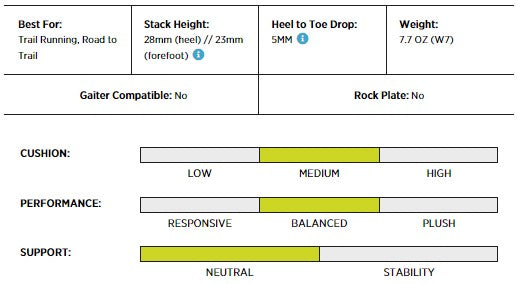 En trailsko til erfarne løbere, der ønsker at begynde at løbe på stier. Designet til brug på let til moderat terræn, med en nem overgang fra sti til vej. Nu med en hældning på 5 mm tilbyder den forøgede 28 x 23 mm platform yderligere støddæmpning og komfort, mens vores nye ZipFoam™ mellemsål giver en mere responsiv løbetur. Den fleksible Vibram® XS Trek EVO ydersål giver fremragende greb på forskellige overflader. Genbrugsmaterialer bruges nu i overdel, foring og indersål.