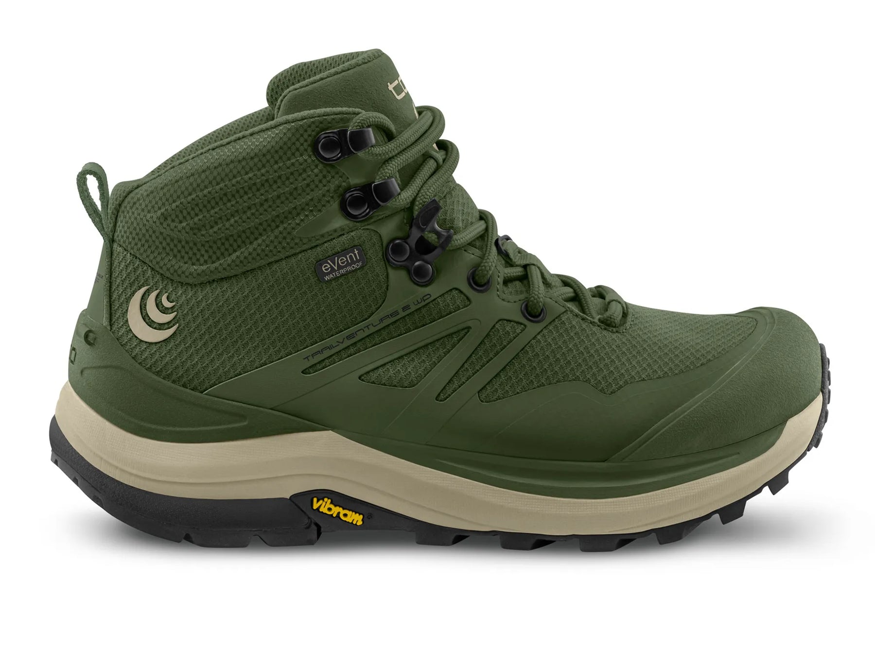 Trailventure 2 WP is built to take on rugged terrain, rain or shine. The durable mesh upper features a full eVent® waterproof bootie construction to keep feet dry in wet conditions. The widened platform features a ZipFoam™ midsole for comfort and response, while an external TPU heel counter offers additional security. The Vibram® Megagrip outsole provides grip on all surfaces, wet or dry, while the full length ESS rock plate offers protection and stability on technical trails. Style: W054 Colour shown: Olive-Tan